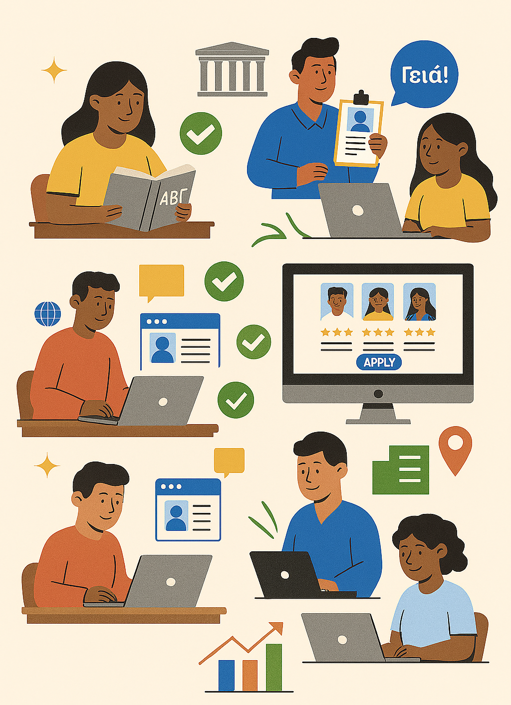 Whether you need guidance in job searching, communication with institutions, or planning your stay and travels in Greece, our team is here to assist you with clarity and integrity.